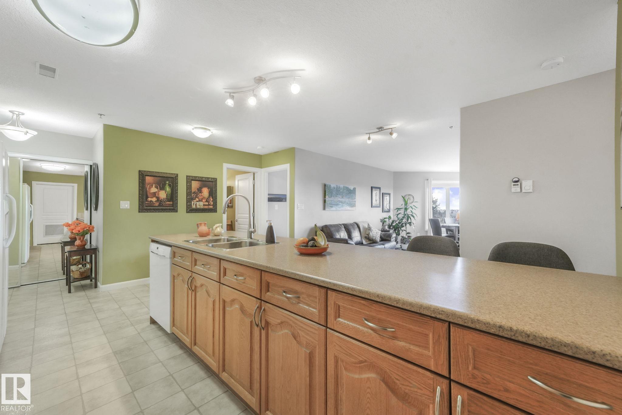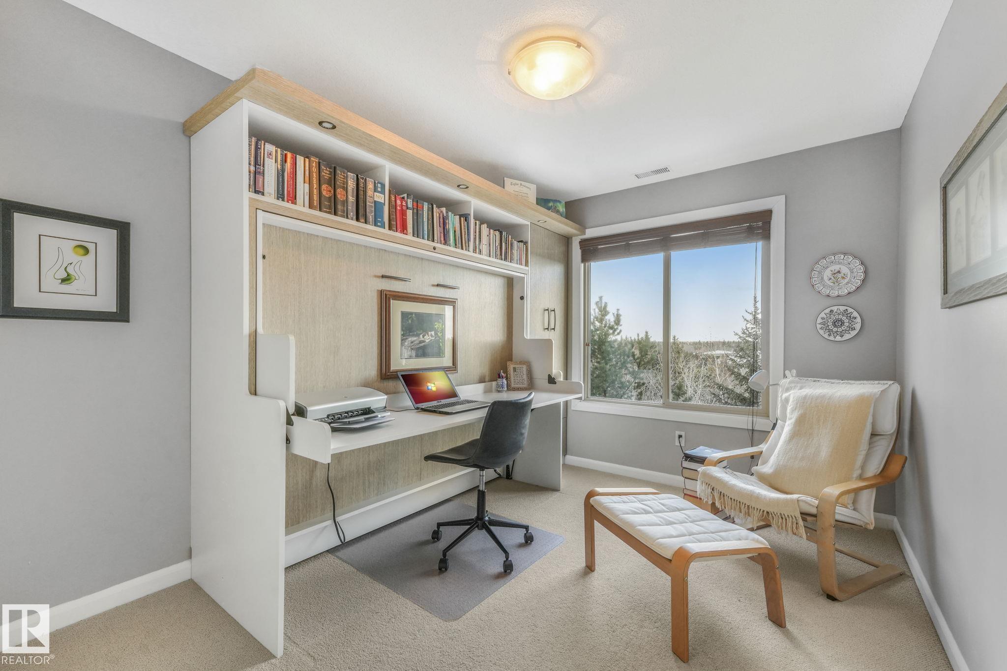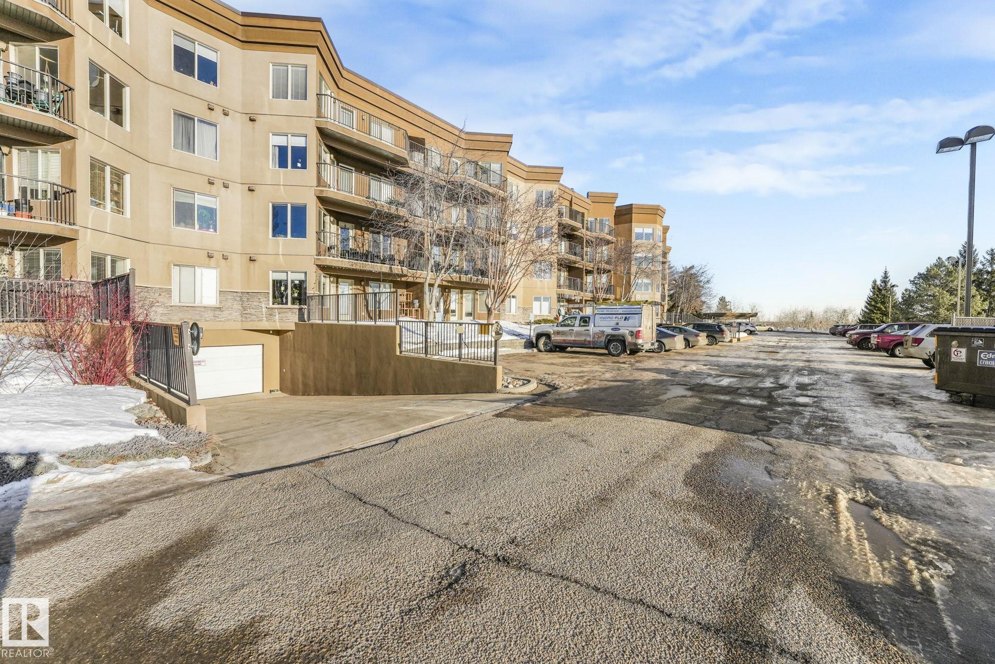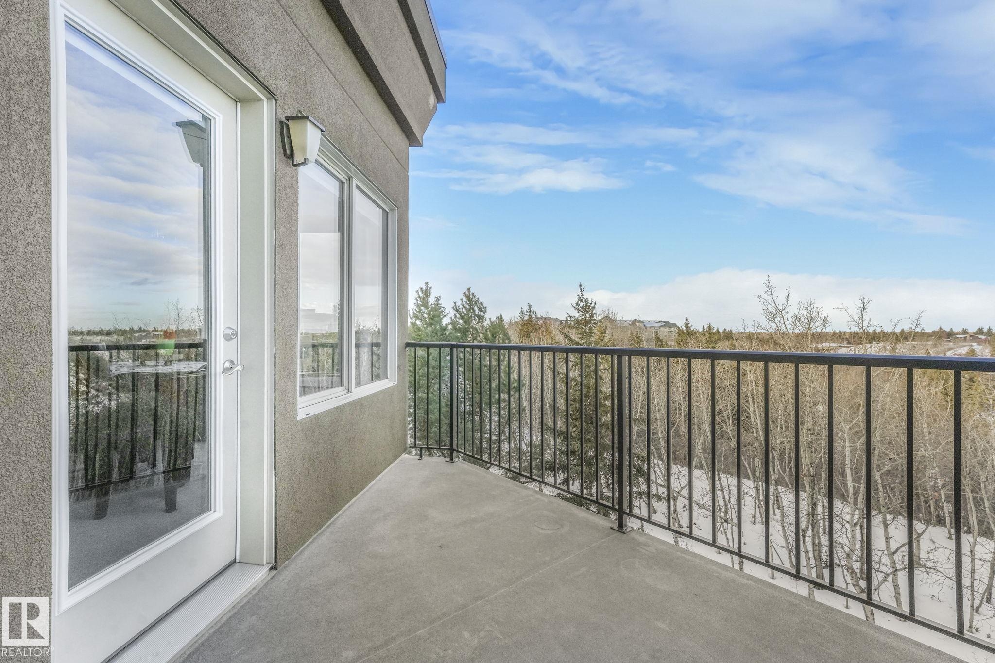 OVERLOOKING THE RAVINE! IMMACULATE TOP FLOOR UNIT. This modern 2 bedroom and 2 full bath, 18+ unit in the "Ridge At Hermitage" is immaculate! Features include: modern open concept kitchen with expansive breakfast bar, bright and warm ceiling height cabinets, spacious living room, large balcony, insuite laundry/storage, central elevators and underground parking stall with storage cage., Main bedroom has a walk-through closet and a 3pc ensuite. 2nd bedroom is next to a 4pc bath and has a custom murphy bed that converts to a desk and filing cabinet(5000. value). Bedrooms are on opposite ends of unit perfect for company/room mate. Parking is close to elevator. Extra features: A/C, visitor parking, car wash, Social and Exercise rooms. All utilities are included in the condo fees, except power PET FREINDLY with board approval close to off leash area. Extensive walking/biking trails, skiing and golf nearby. Quick access to all amenities and major routes!