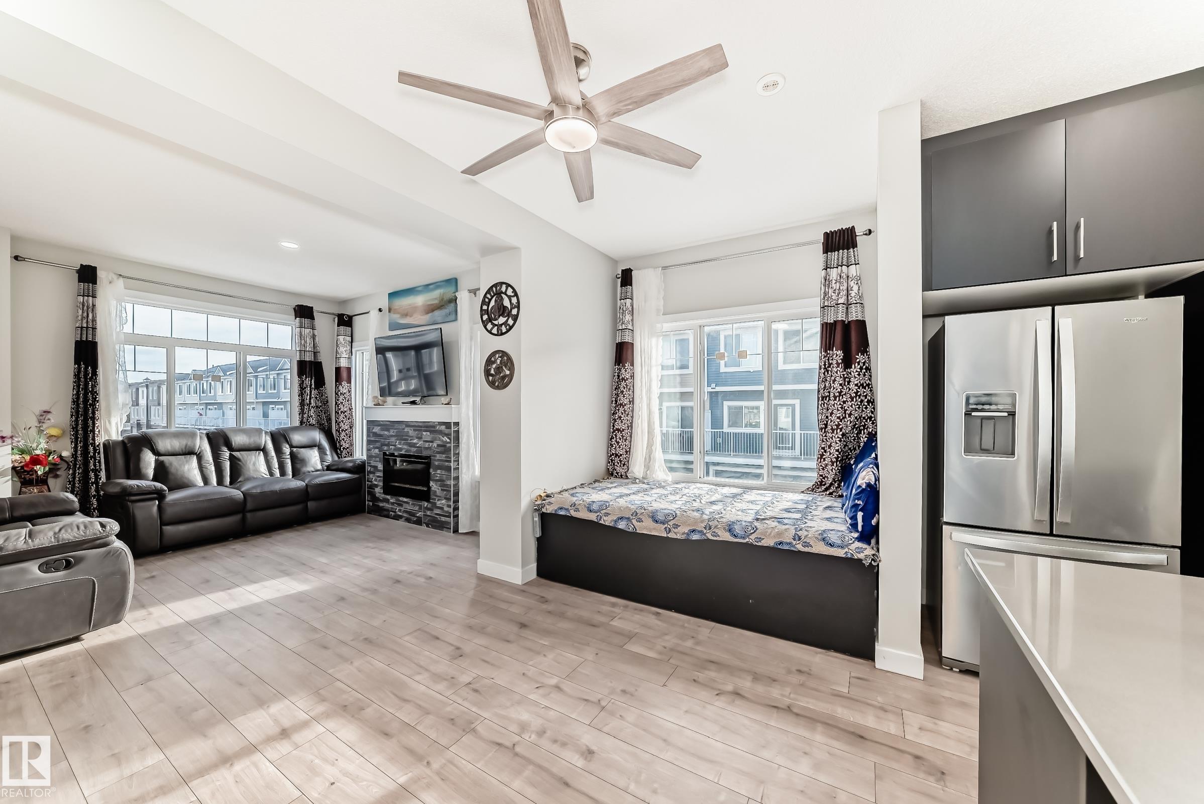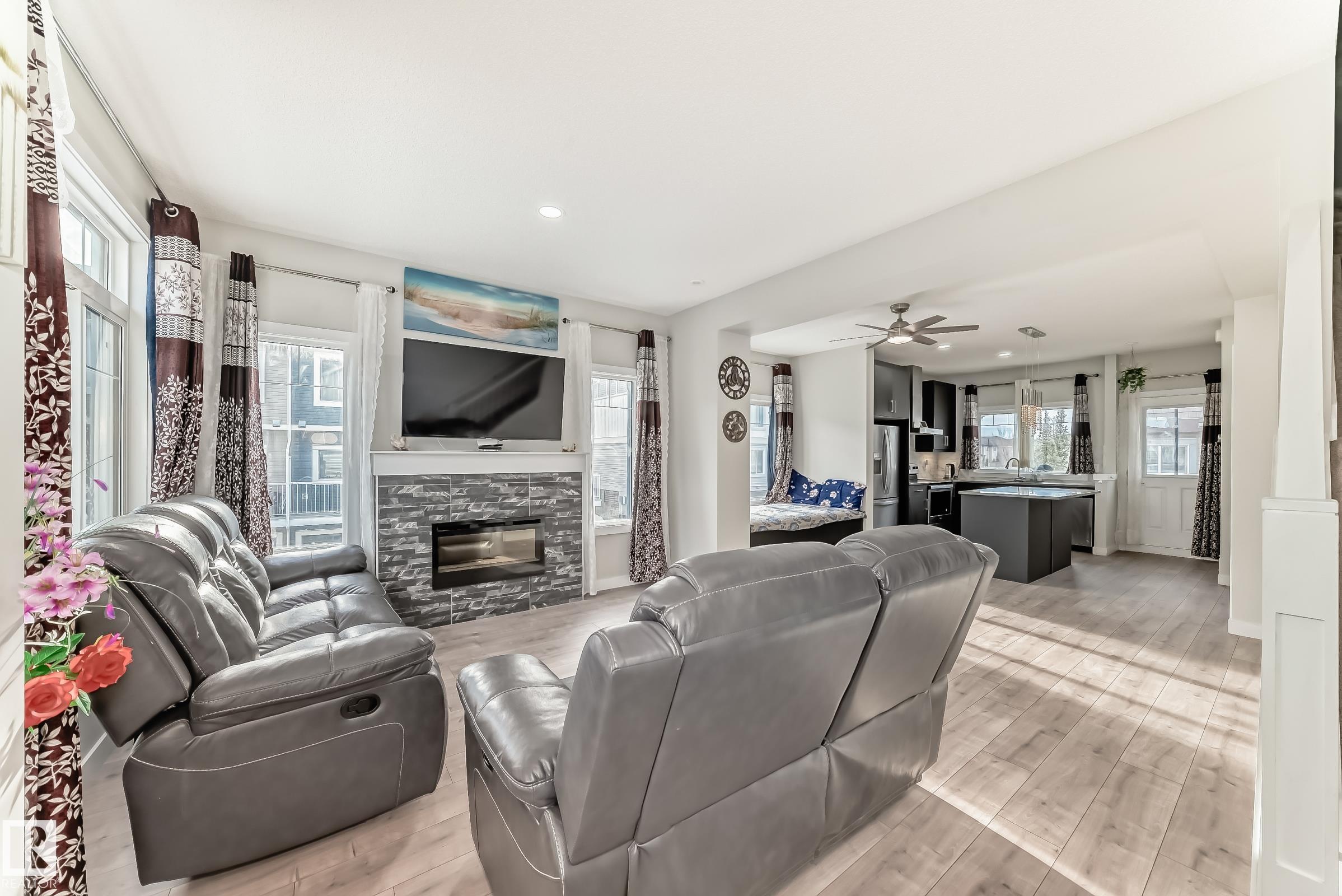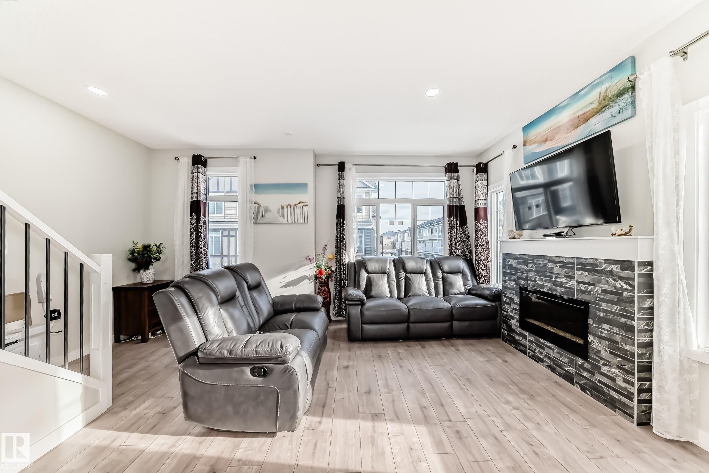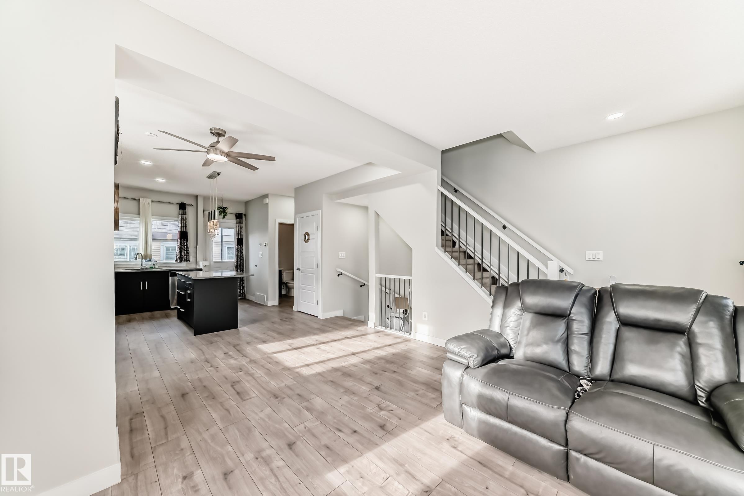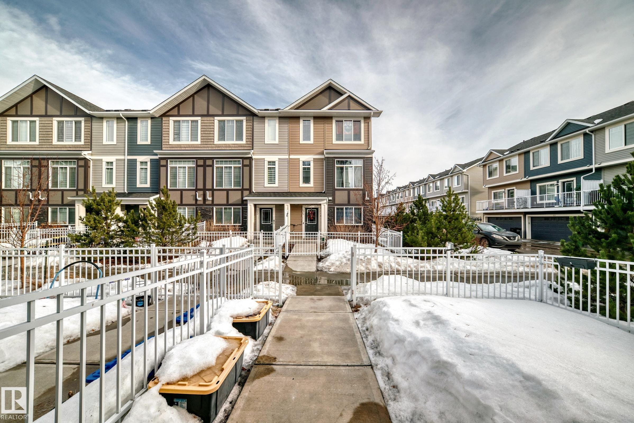 Former Showhome!! Welcome to this modern 3-storey corner townhome. This well-designed home offers 3 bedrooms and 2.5 bathrooms with an ideal layout for today?s lifestyle. The main floor features a versatile den/office, perfect for working from home, along with access to the heated attached garage. The second level showcases an open-concept living space with an upgraded kitchen featuring premium stone countertops, upgraded cabinetry, and ample prep space. The living room is highlighted by a stylish electric fireplace, and a convenient half bathroom completes this floor. Upstairs, the third level offers three bedrooms, including a spacious primary suite with a full ensuite, plus an additional full bathroom. Upgraded lighting and ceiling fans are found throughout the home. This smart-enabled townhome allows you to control lighting, fans, garage, and front door directly from your phone. Close to schools, parks, shopping, transit, and major roadways, this property offers excellent value and convenience.