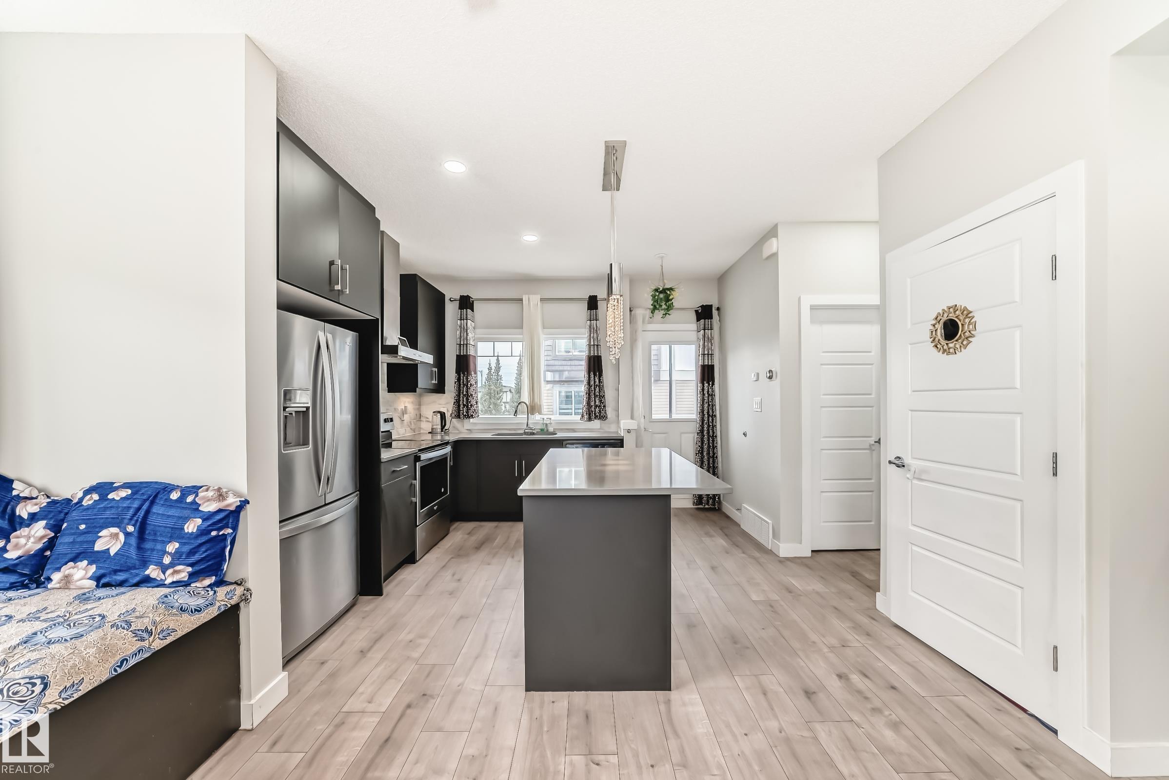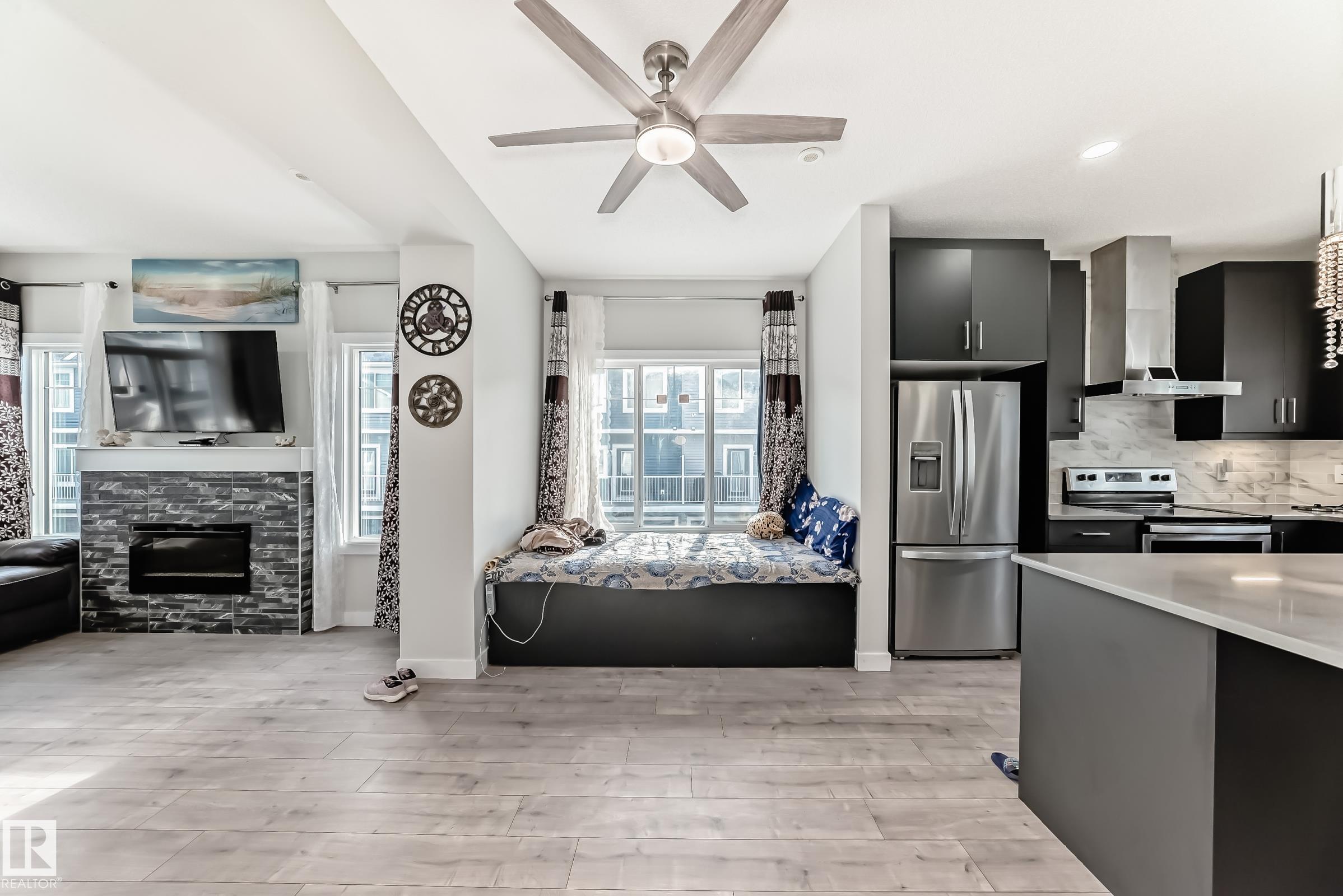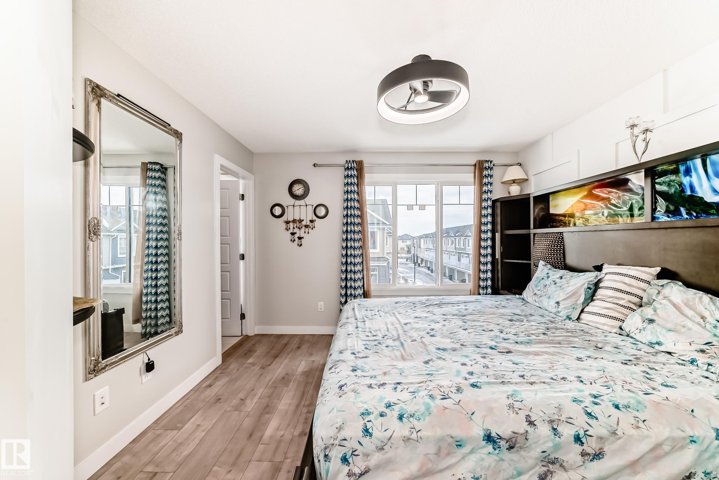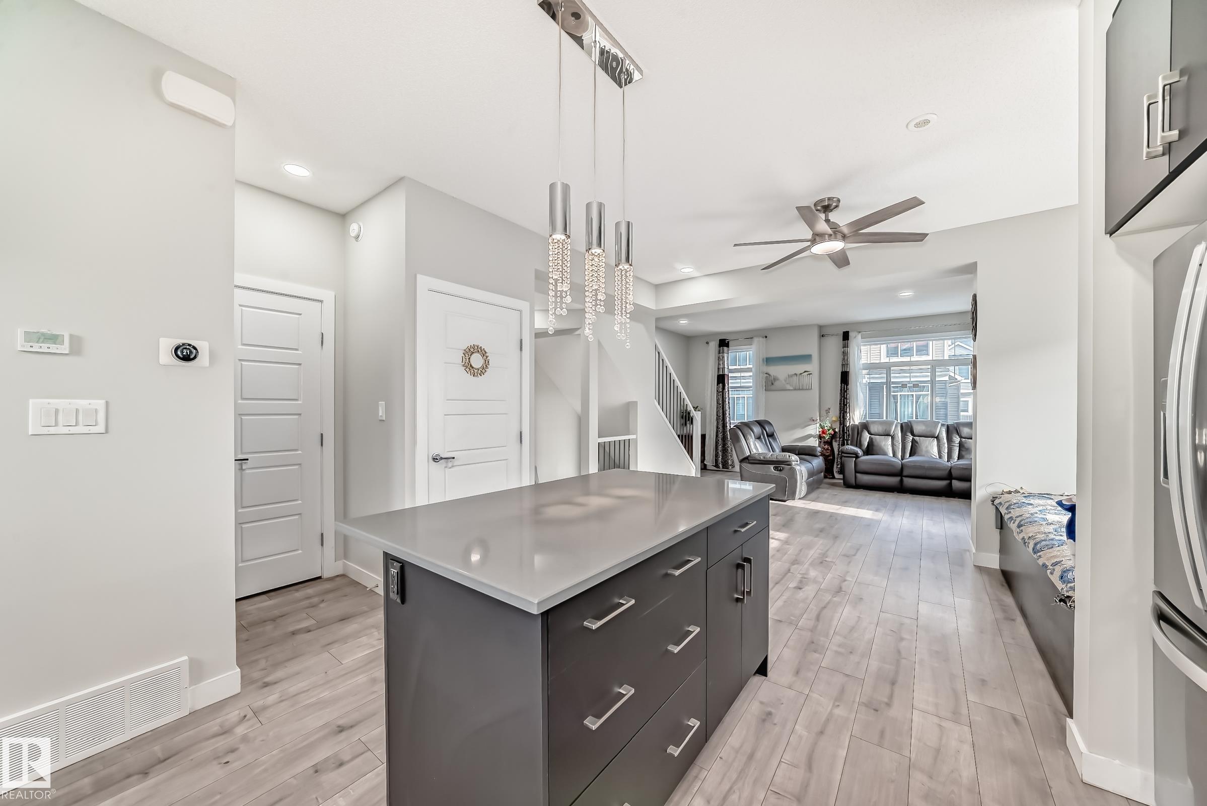 Former Showhome!! Welcome to this modern 3-storey corner townhome. This well-designed home offers 3 bedrooms and 2.5 bathrooms with an ideal layout for today?s lifestyle. The main floor features a versatile den/office, perfect for working from home, along with access to the heated attached garage. The second level showcases an open-concept living space with an upgraded kitchen featuring premium stone countertops, upgraded cabinetry, and ample prep space. The living room is highlighted by a stylish electric fireplace, and a convenient half bathroom completes this floor. Upstairs, the third level offers three bedrooms, including a spacious primary suite with a full ensuite, plus an additional full bathroom. Upgraded lighting and ceiling fans are found throughout the home. This smart-enabled townhome allows you to control lighting, fans, garage, and front door directly from your phone. Close to schools, parks, shopping, transit, and major roadways, this property offers excellent value and convenience.