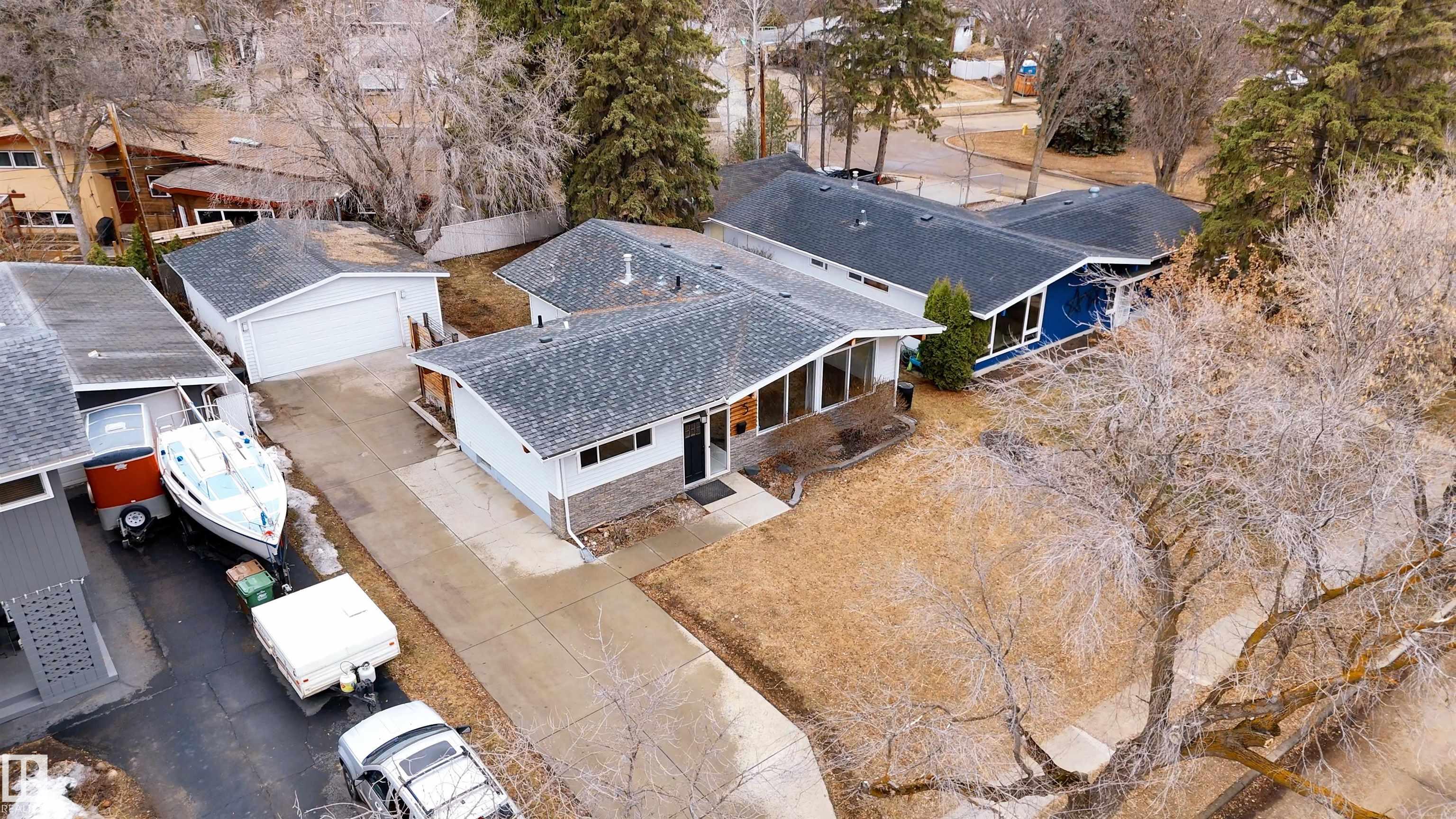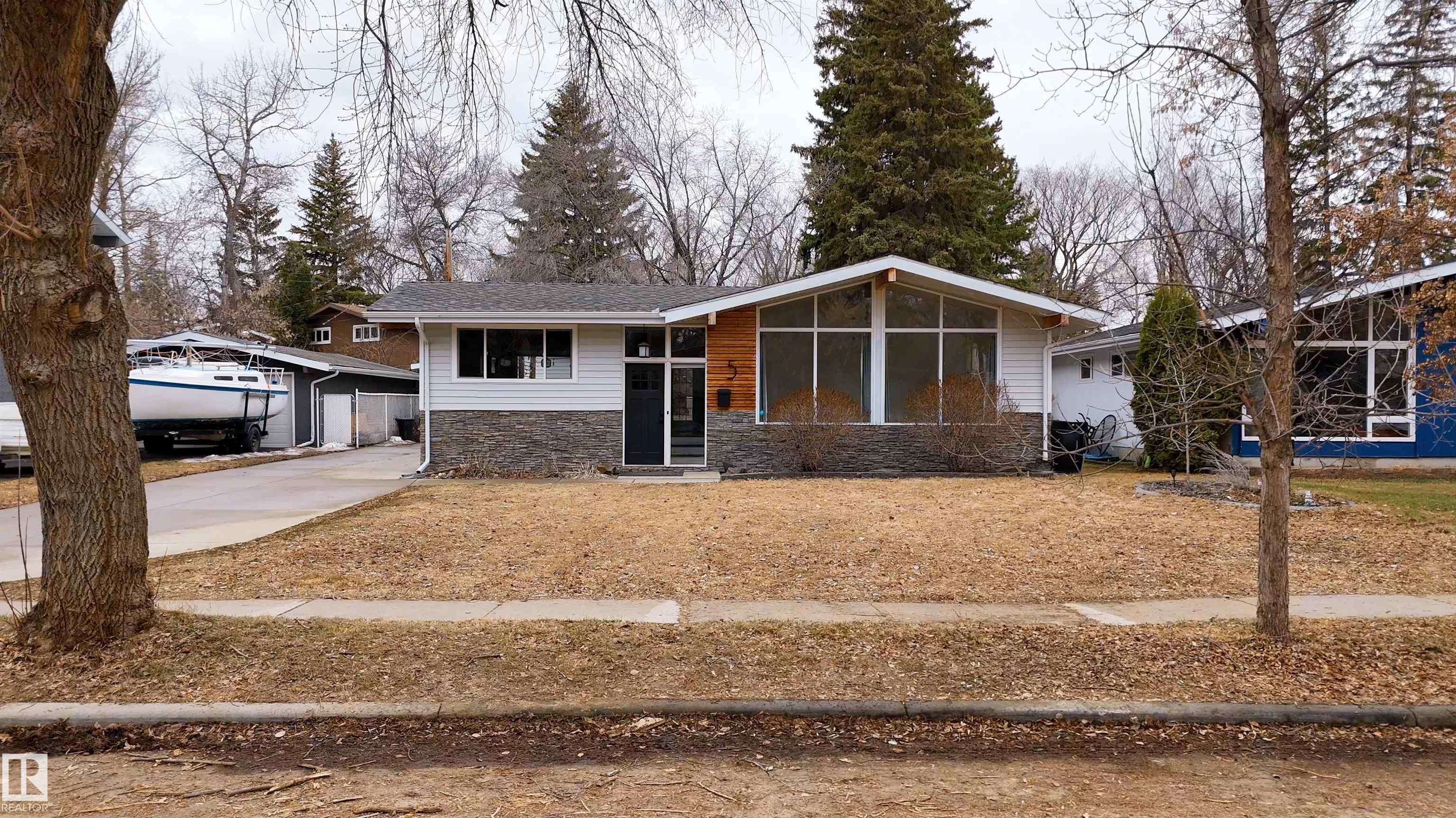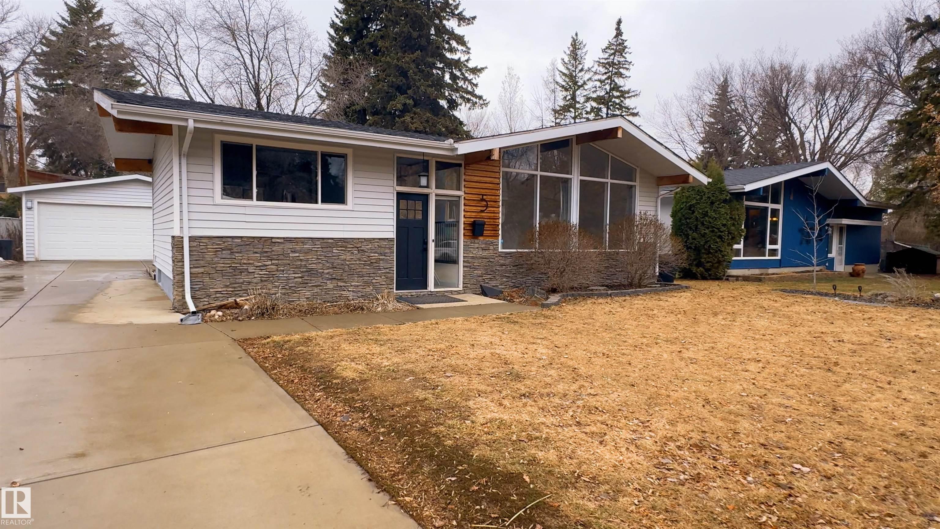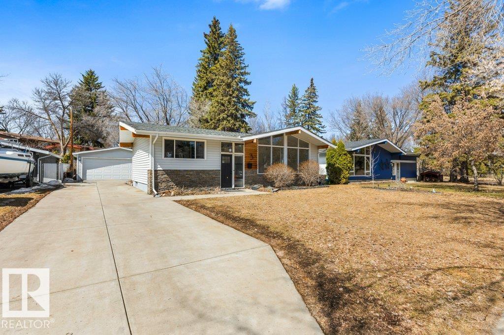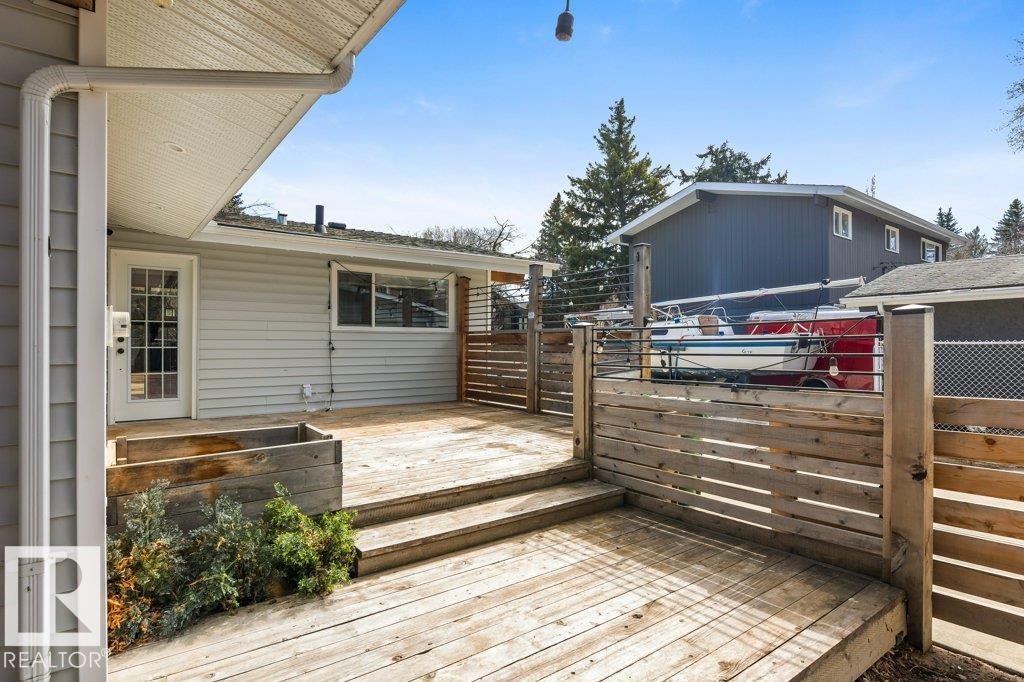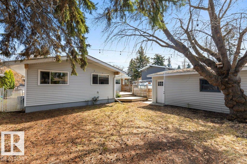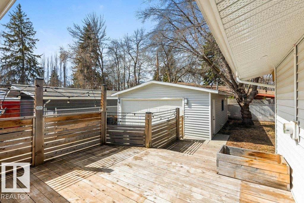 Welcome to this beautifully maintained 1,216 sq ft bungalow in the sought-after Gardens neighborhood of St. Albert. This home offers three spacious bedrooms on the main floor, including a primary suite with its own 3-piece ensuite, plus a full 4-piece main bath. The bright and inviting living room features vaulted ceilings, open beams, and large banks of windows that flood the space with natural light. The updated kitchen boasts quartz countertops and stainless steel appliances, with a separate dining area ideal for family meals and entertaining. Downstairs, the fully finished basement provides a large recreation room, versatile flex space, and ample storage with a dedicated laundry area and additional room for future development. Outside, enjoy a private deck with a built-in privacy screen, perfect for relaxing or hosting guests, along with a double detached garage. Located in a fantastic neighborhood close to downtown, Lions Park, the farmers? market, schools, and all amenities.