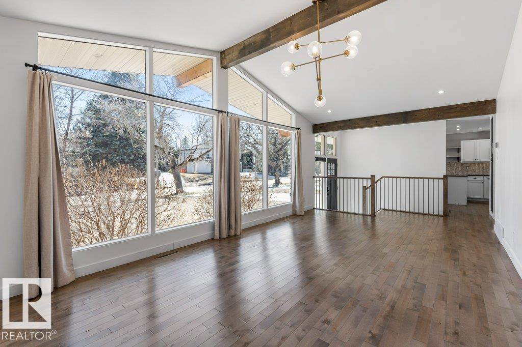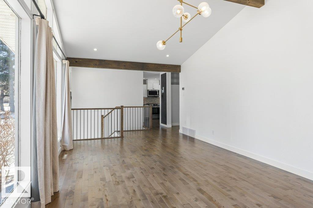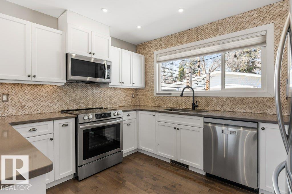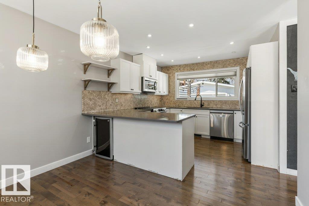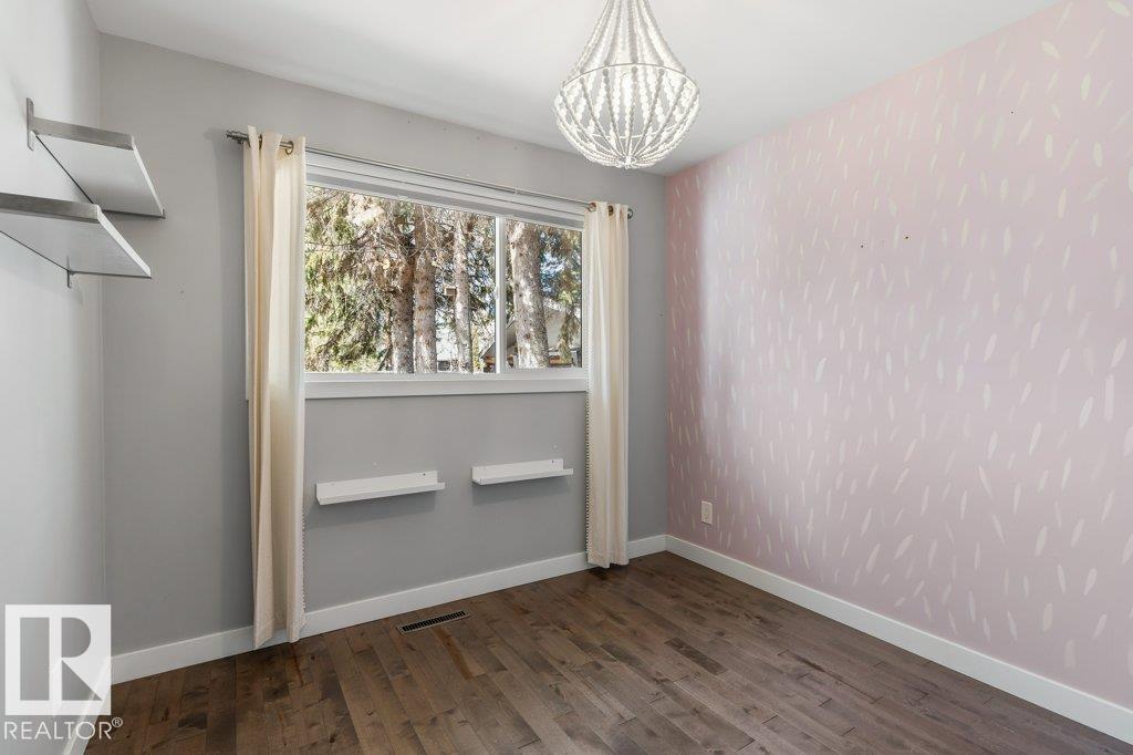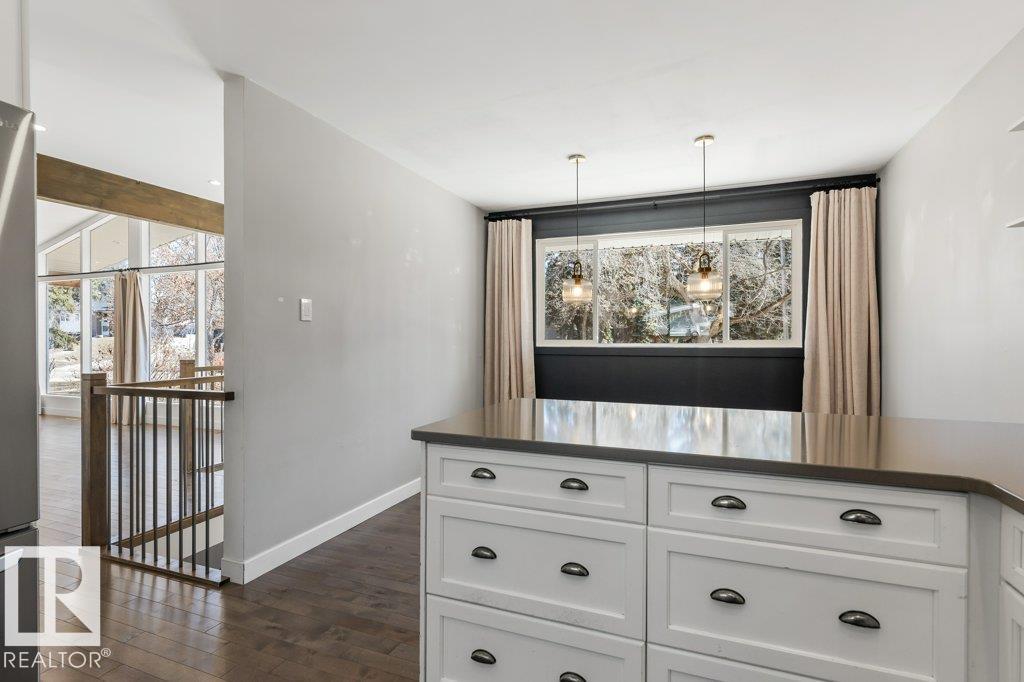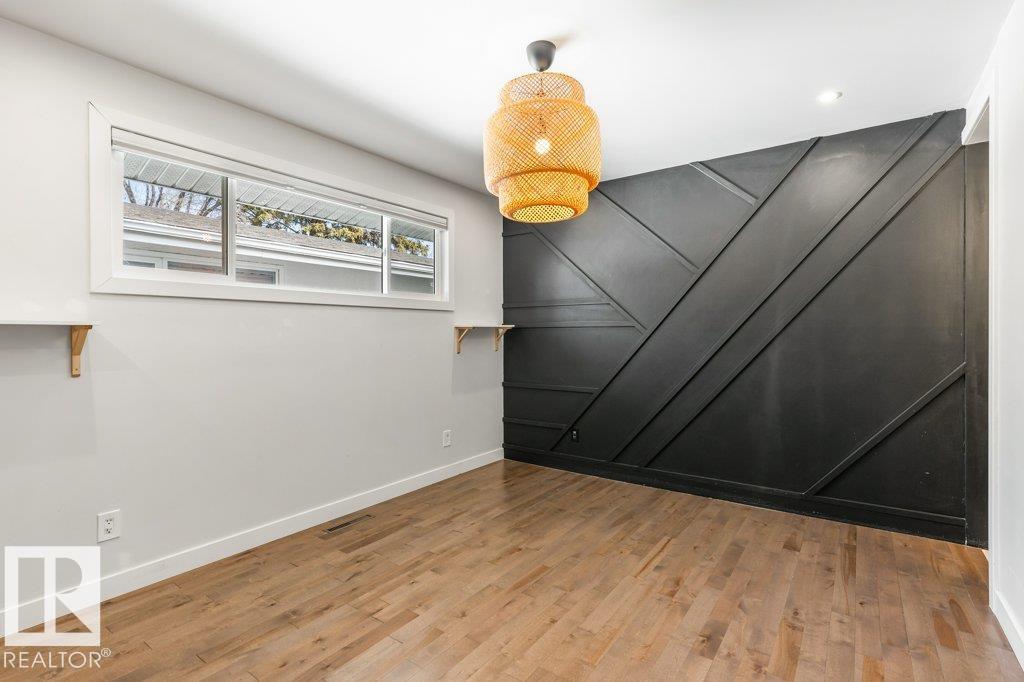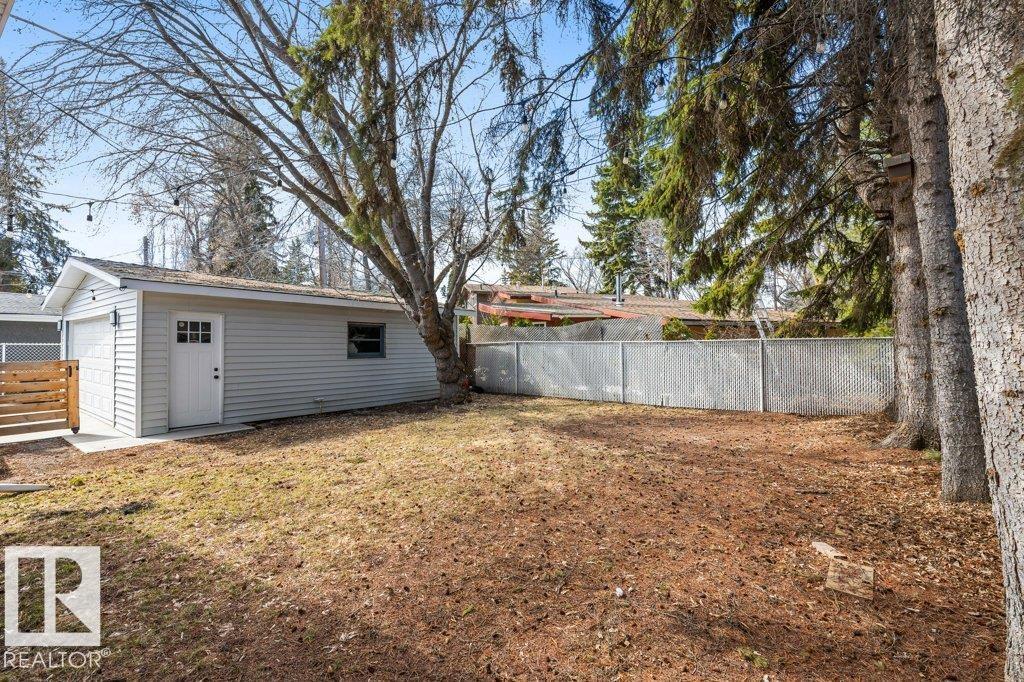 Welcome to this beautifully maintained 1,216 sq ft bungalow in the sought-after Gardens neighborhood of St. Albert. This home offers three spacious bedrooms on the main floor, including a primary suite with its own 3-piece ensuite, plus a full 4-piece main bath. The bright and inviting living room features vaulted ceilings, open beams, and large banks of windows that flood the space with natural light. The updated kitchen boasts quartz countertops and stainless steel appliances, with a separate dining area ideal for family meals and entertaining. Downstairs, the fully finished basement provides a large recreation room, versatile flex space, and ample storage with a dedicated laundry area and additional room for future development. Outside, enjoy a private deck with a built-in privacy screen, perfect for relaxing or hosting guests, along with a double detached garage. Located in a fantastic neighborhood close to downtown, Lions Park, the farmers? market, schools, and all amenities.